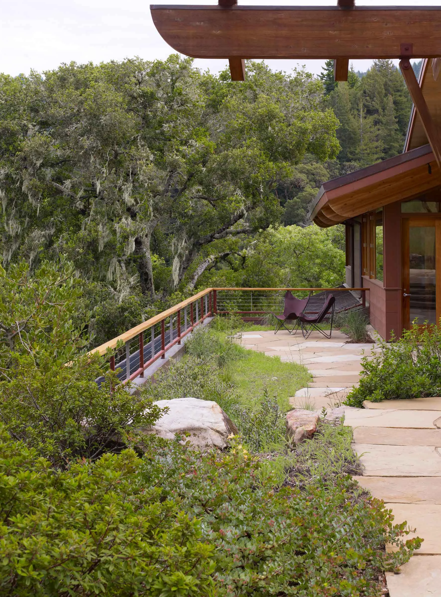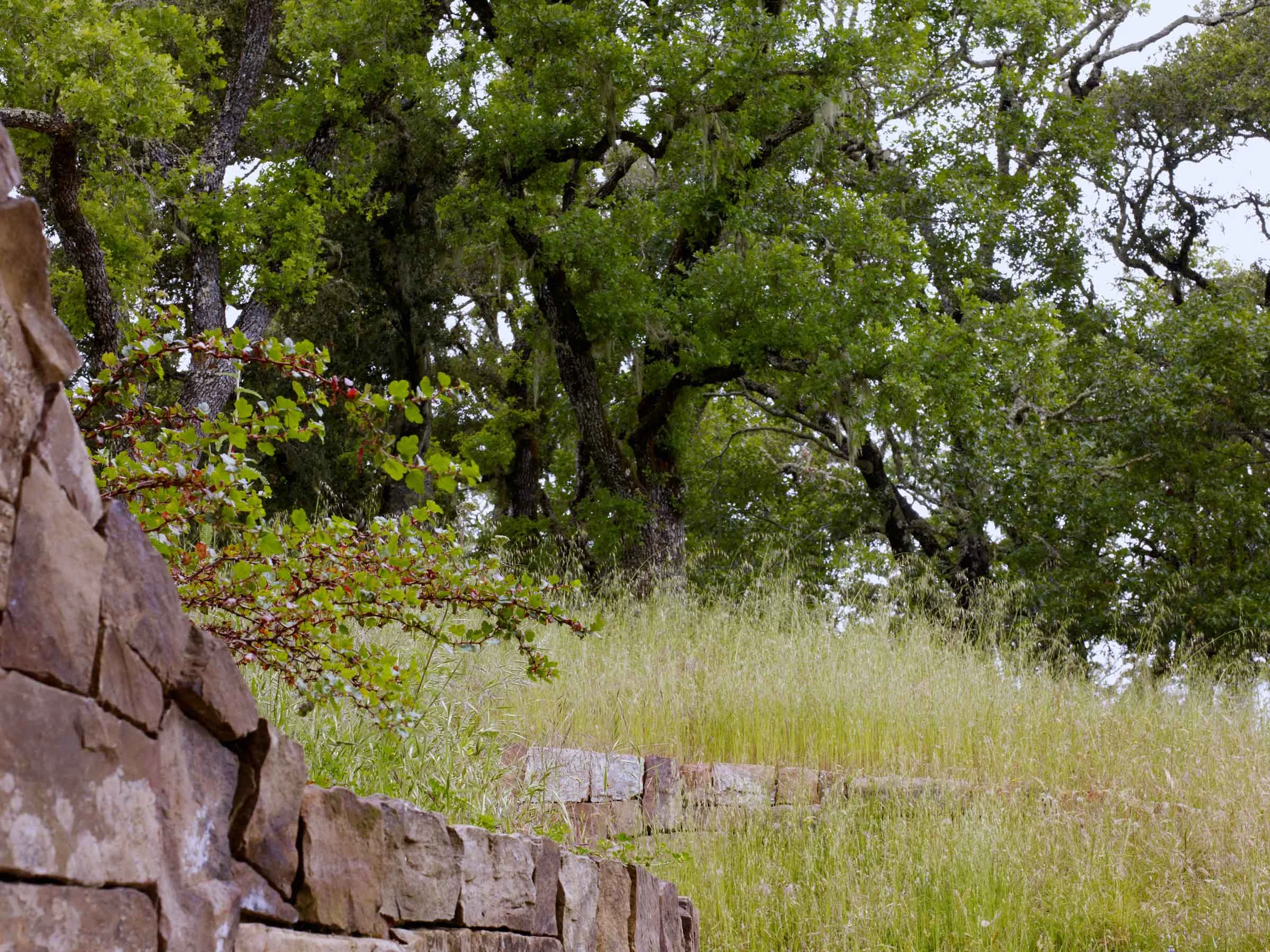 Native Oak trees anchor this residential landscape tucked into an expansive open space preserve. The ethic of environmental conservation and stewardship enshrined in the surrounding preserve dictated that the new home and landscape be sited delicately around existing trees, grasslands, and topography.